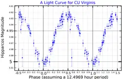 CU Virginis has three times the mass of the Sun and double the Sun's radius. It is radiating 100 times the Sun's luminosity from its photosphere at an effective temperature of 12,750 K.[8] The star has a strong magnetic field, placing it in the class of magnetic chemically peculiar stars. The polar magnetic field has a strength of about 3 kG.[13] The magnetic pole may be displaced by 87° from the axis of rotation, and the effective magnetic field is seen to vary over the course of a rotation.[13] The mean surface magnetic field varies over the range 1.2–3.2 kG.[15]