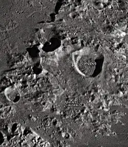 By convention these features are identified on lunar maps by placing the letter on the side of the crater midpoint that is closest to Calippus.