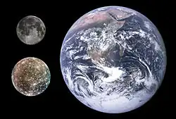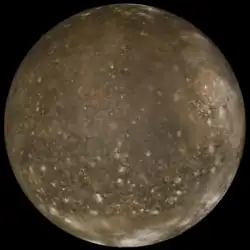 ![]() Callisto imaged in approximately true color by the Voyager 2 spacecraft, July 1979 | |||||||||
