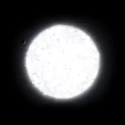 An early interferometric measurement of its angular diameter in 1968 gave a limb-darkened value of 6.86 mas, close to the accepted modern value.[61] Very-long-baseline interferometry has been used to calculate Canopus' angular diameter at 6.9 mas. Combined with distance calculated from its Hipparcos parallax, this gives it a radius of 71 times that of the Sun.[53] If it were at the centre of the Solar System, it would extend 90% of the way to the orbit of Mercury.[62] The radius and temperature relative to the Sun means that it is 10,700 times more luminous than the Sun, and its position in the H-R diagram relative to theoretical evolutionary tracks means that it is 8.0±0.3 times as massive as the Sun.[53] Measurements of its shape find a 1.1° departure from spherical symmetry.[63]