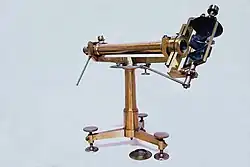 Gauss took on the directorship of the 60-year-old observatory, founded in 1748 by Prince-elector George II and built on a converted fortification tower,[29] with usable, but partly out-of-date instruments.[30] The construction of a new observatory had been approved by Prince-elector George III in principle since 1802, and the Westphalian government continued the planning,[31] but Gauss could not move to his new place of work until September 1816.[23] He got new up-to-date instruments, including two meridian circles from Repsold[32] and Reichenbach,[33] and a heliometer from Fraunhofer.[34]