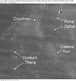 Catena Yuri lies to the south of Rima Zahia and east of Dorsum Thera.