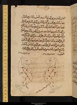 The earliest surviving celestial globe was made between 1080 and 1085 C.E. by Ibrahim ibn Said al-Sahli, a well-known astrolabe maker working in Valencia, Spain.[12] Although the imagery on this globe appears to be unrelated to that in al-Sufi's The Book of the Constellations al-Wazzan does seem to have been aware of this work, as all forty-eight of the classical Greek constellations are illustrated on the globe, just as in al-Sufi's treatise, with the stars indicated by circles.[13]