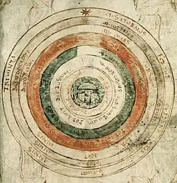 Some late medieval figures noted that the celestial spheres' physical order was inverse to their order on the spiritual plane, where God was at the center and the Earth at the periphery. Near the beginning of the fourteenth century Dante, in the Paradiso of his Divine Comedy, described God as a light at the center of the cosmos.[70] Here the poet ascends beyond physical existence to the Empyrean Heaven, where he comes face to face with God himself and is granted understanding of both divine and human nature. Later in the century, the illuminator of Nicole Oresme's Le livre du Ciel et du Monde, a translation of and commentary on Aristotle's De caelo produced for Oresme's patron, King Charles V, employed the same motif. He drew the spheres in the conventional order, with the Moon closest to the Earth and the stars highest, but the spheres were concave upwards, centered on God, rather than concave downwards, centered on the Earth.[71] Below this figure Oresme quotes the Psalms that "The heavens declare the Glory of God and the firmament showeth his handiwork."[72]
