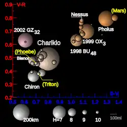 The colours of centaurs are very diverse, which challenges any simple model of surface composition.[26] In the side-diagram, the colour indices are measures of apparent magnitude of an object through blue (B), visible (V) (i.e. green-yellow) and red (R) filters. The diagram illustrates these differences (in exaggerated colours) for all centaurs with known colour indices. For reference, two moons: Triton and Phoebe, and planet Mars are plotted (yellow labels, size not to scale).