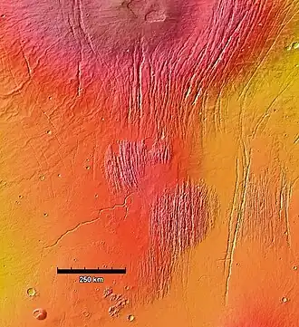 - ↑ Anderson, R.C. et al. (2001). Primary Centers and Secondary Concentrations of Tectonic Activity through Time in the Western Hemisphere of Mars. J. Geophys. Res., 106(E9).