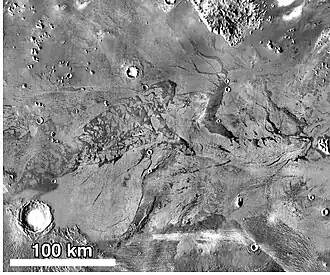 Cerberus Palus once contained a lake fed by Athabasca Valles and draining into Lethe Vallis. According to different researches, it could be a lake of water[2] or lava.[3] It is notable by giant plates (up to 50 km and more), similar to pack ice,[2] but possibly pieces of lava crust.[3] Gaps between the plates contain spiral-shaped geological features, probably lava coils.[3][4]