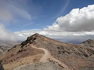 Chacaltaya (Mollo language for "bridge of winds" or "winds meeting point", Aymara for "cold road"[1]) is a mountain in the Cordillera Real, one of the mountain ranges of the Cordillera Oriental, itself a range of the Bolivian Andes. Its elevation is 5,421 meters (17,785 ft). Chacaltaya's glacier — which was as old as 18,000 years — had an area of 0.22 km2 (0.085 sq mi) in 1940, which had been reduced to 0.01 km2 (0.0039 sq mi) in 2007 and was completely gone by 2009.[2][3][4] Half of the meltdown, as measured by volume, took place before 1980.[5] The final meltdown after 1980, due to missing precipitation and the warm phase of El Niño, resulted in the glacier's disappearance in 2009.[6] The glacier was located about 30 kilometers (19 mi) from La Paz, near Huayna Potosí mountain.