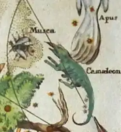 Chamaeleon was one of twelve constellations created by Petrus Plancius from the observations of Pieter Dirkszoon Keyser and Frederick de Houtman.[2] It first appeared on a 35-cm diameter celestial globe published in 1597 (or 1598) in Amsterdam by Plancius and Jodocus Hondius. Johann Bayer was the first uranographer to put Chamaeleon in a celestial atlas. It was one of many constellations created by European explorers in the 15th and 16th centuries out of unfamiliar Southern Hemisphere stars.[3]