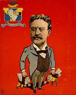 Caricature from 1899 showing Chicago mayor Carter Harrison IV fighting the "Allen bill", signed by Governor John Riley Tanner, that gave control of Chicago's intra-city transportation system to Yerkes.