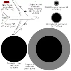 The United States space agency NASA estimated the diameter of the bolide at about 17 to 20 m (56 to 66 ft) and has revised the mass several times from an initial 7,700 tonnes (7,600 long tons; 8,500 short tons),[11] until reaching a final estimate of 10,000 tonnes (9,800 long tons; 11,000 short tons).[11][34][35][36][37] The air burst's blast wave, when it hit the ground, produced a seismic wave which registered on seismographs at magnitude (mbLg) 4.2.[38]
