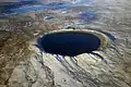 ![]() Imaging from NASA's Shuttle Radar Topography Mission STS-99 reveals part of the diameter ring of the crater in the form of a shallow circular trough. Numerous cenotes (sinkholes) cluster around the trough marking the inner crater rim.[1] | |