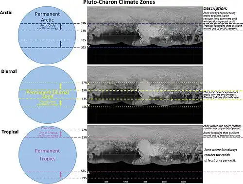 There are five climate zones on Pluto which are defined by the sub-solar latitude,[1] each with specific boundaries. However, the latitude ranges of the climate zones expand and shrink in response to the obliquity range of Pluto from a minimum of 103° to a maximum of 127° over the 2.8 million year oscillation period.[11][12] That means some of the zones have permanent latitude ranges, whereas other zones change their boundaries based on the variation of the axial tilt on a multi-million-year time scale. Permanent boundaries refer to the latitude zones that experience certain characteristics at all times, regardless of the obliquity variation of the dwarf planet over the obliquity oscillation period. Because Charon is tidally-locked with Pluto, it has the same structure of climate zones.[1]