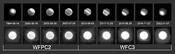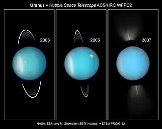 Hubble images showing the seasonal changes in the atmosphere of Uranus. The south of Uranus is at the upper right and north is at the lower left. The south polar cap disappears between 2007 and 2011 and the north polar cap appears between 2010 and 2015.
