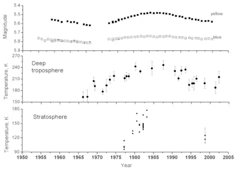 The visible magnitude of Uranus in two spectral bands (upper graph)[16] adjusted for the distance, effective microwave temperature (middle graph) and the stratospheric temperature (lower graph).[17] Blue band is centered at 470 nm, yellow at 550 nm.