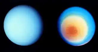 Uranus's southern hemisphere in approximate natural colour (left) and in higher wavelengths (right), showing its faint cloud bands and atmospheric "hood" as seen by Voyager 2