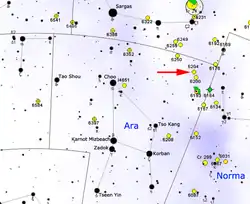 NGC 6204 is an open cluster in the constellation Ara, lying close to the galactic equator.[3] It is 3,540 ly (1,085 pc) distant from Earth. The cluster was discovered on 13 May 1826 by British astronomer James Dunlop.[4]