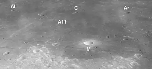 Collins is a tiny lunar impact crater located on the southern part of the Mare Tranquillitatis. It is located about 25 kilometers to the north of the Apollo 11 landing site, Tranquility Base. Named after American astronaut Michael Collins,[1] the crater is the central member of the row of three craters named in honor of the Apollo 11 crew members. About 15 kilometers to the west-northwest is the landing site of the Surveyor 5 lunar probe.