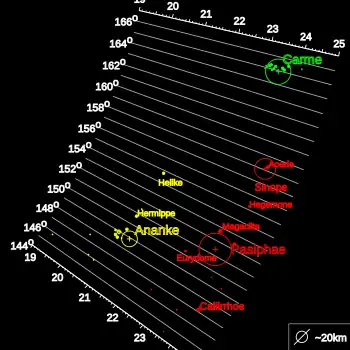 Diagram showing the similarities between the satellites of each of the outer groups of Jovian moons