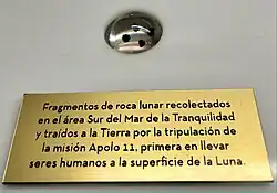 At the request of then United States President Richard Nixon, NASA had about 250 presentation plaques made following Apollo 11 in 1969. Each included about four rice-sized particles of Moon dust from the mission totaling about 50 mg.[1][2] The Apollo 11 lunar sample display has an acrylic plastic button containing the Moon dust mounted with the recipient's country or state flag that had been to the Moon and back. All 135 countries received the display, as did the 50 states of the United States and the U.S. provinces and the United Nations.[1]