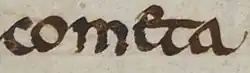The word comet derives from the Old English cometa from the Latin comēta or comētēs. That, in turn, is a romanization of the Greek κομήτης 'wearing long hair', and the Oxford English Dictionary notes that the term (ἀστὴρ) κομήτης already meant 'long-haired star, comet' in Greek. Κομήτης was derived from κομᾶν (koman) 'to wear the hair long', which was itself derived from κόμη (komē) 'the hair of the head' and was used to mean 'the tail of a comet'.[13][14]