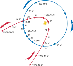 The first observations were made in the 1980s and 1990s as several spacecraft flew by comets 21P/Giacobini–Zinner,[61] 1P/Halley,[62] and 26P/Grigg–Skjellerup.[63] It was then found that the bow shocks at comets are wider and more gradual than the sharp planetary bow shocks seen at, for example, Earth. These observations were all made near perihelion when the bow shocks already were fully developed.
