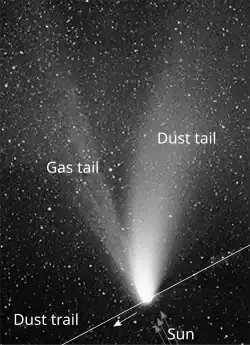 The streams of dust and gas each form their own distinct tail, pointing in slightly different directions. The tail of dust is left behind in the comet's orbit in such a manner that it often forms a curved tail called the type II or dust tail.[55] At the same time, the ion or type I tail, made of gases, always points directly away from the Sun because this gas is more strongly affected by the solar wind than is dust, following magnetic field lines rather than an orbital trajectory.[69] On occasions—such as when Earth passes through a comet's orbital plane, the antitail, pointing in the opposite direction to the ion and dust tails, may be seen.[70]