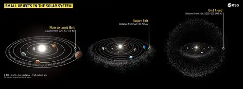 The Oort cloud is thought to occupy a vast space starting from between 2,000 and 5,000 AU (0.03 and 0.08 ly)[110] to as far as 50,000 AU (0.79 ly)[86] from the Sun. This cloud encases the celestial bodies that start at the middle of the Solar System—the Sun, all the way to outer limits of the Kuiper Belt. The Oort cloud consists of viable materials necessary for the creation of celestial bodies. The Solar System's planets exist only because of the planetesimals (chunks of leftover space that assisted in the creation of planets) that were condensed and formed by the gravity of the Sun. The eccentric made from these trapped planetesimals is why the Oort Cloud even exists.[111] Some estimates place the outer edge at between 100,000 and 200,000 AU (1.58 and 3.16 ly).[110] The region can be subdivided into a spherical outer Oort cloud of 20,000–50,000 AU (0.32–0.79 ly), and a doughnut-shaped inner cloud, the Hills cloud, of 2,000–20,000 AU (0.03–0.32 ly).[112] The outer cloud is only weakly bound to the Sun and supplies the long-period (and possibly Halley-type) comets that fall to inside the orbit of Neptune.[86] The inner Oort cloud is also known as the Hills cloud, named after Jack G. Hills, who proposed its existence in 1981.[113] Models predict that the inner cloud should have tens or hundreds of times as many cometary nuclei as the outer halo;[113][114][115] it is seen as a possible source of new comets that resupply the relatively tenuous outer cloud as the latter's numbers are gradually depleted. The Hills cloud explains the continued existence of the Oort cloud after billions of years.[116]