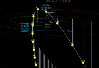 After its close approach to the Earth, the comet faded to about 2nd magnitude. It reached perihelion on 1 May 1996, brightening again and exhibiting a dust tail in addition to the gas tail seen as it passed the Earth. By this time, however, it was close to the Sun and was not seen as easily. It was observed passing perihelion by the SOHO Sun-observing satellite, which also recorded a large coronal mass ejection being formed at the same time. The comet's distance from the Sun at perihelion was 0.23 AU, well inside the orbit of Mercury.[13]