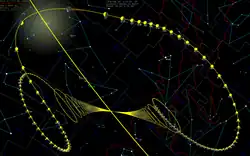 With a nearly parabolic trajectory, estimates for the orbital period of this comet have varied from 254,000[2] to 558,000 years.[6] Computing the best-fit orbit for this long-period comet is made more difficult since it underwent a splitting event which may have caused a non-gravitational perturbation of the orbit. The 2008 SAO Catalog of Cometary Orbits shows 195 observations for C/1975 V1 and 135 for C/1975 V1-A, for a combined total of 330 (218 observations were used in the fit).