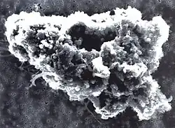 The next size class is large, "fluffy"[4][5] or "cluster-type"[8] aggregates of the above grains. These are typically 20-100 micrometers, a size not arbitrary but observed[9] as the porous aggregates tend to fracture[10] or compact.[8][11][12]