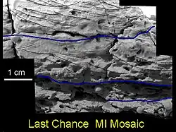 Examination in 2004 of Meridiani rocks, showed the first strong in situ evidence for past water by detecting the mineral jarosite, which only forms in water. This discovery proved that water once existed in Meridiani Planum.[95] In addition, some rocks showed small laminations (layers) with shapes that are only made by gently flowing water.[96] The first such laminations were found in a rock called "The Dells." Geologists would say that the cross-stratification showed festoon geometry from transport in subaqueous ripples.[89] A picture of cross-stratification, also called cross-bedding, is shown on the left.