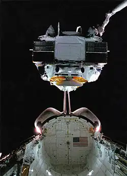 The Compton Gamma Ray Observatory (CGRO) was a space observatory detecting photons with energies from 20 keV to 30 GeV, in Earth orbit from 1991 to 2000. The observatory featured four main telescopes in one spacecraft, covering X-rays and gamma rays, including various specialized sub-instruments and detectors. Following 14 years of effort, the observatory was launched from Space Shuttle Atlantis during STS-37 on April 5, 1991, and operated until its deorbit on June 4, 2000.[3] It was deployed in low Earth orbit at 450 km (280 mi) to avoid the Van Allen radiation belt. It was the heaviest astrophysical payload ever flown at that time at 16,300 kilograms (35,900 lb).