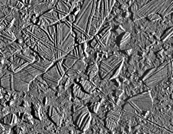 Conamara Chaos is a landscape produced by the disruption of the icy crust of Europa. The region consists of rafts of ice that have moved around and rotated. Surrounding these plates is a lower matrix of jumbled ice blocks which may have been formed as water, slush, or warm ice rose up from below the surface. The region is cited as evidence for a liquid ocean below Europa's icy surface.
