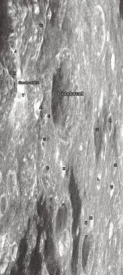 By convention these features are identified on lunar maps by placing the letter on the side of the crater midpoint that is closest to Condorcet.