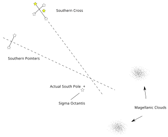 Sigma Octantis is the closest star approximating a southern pole star, but is faint in the night sky. Thus, the pole can be triangulated using the constellation Crux as well as the stars Alpha and Beta Centauri (about 30° counterclockwise from Crux) of the constellation Centaurus (arching over Crux).[23]