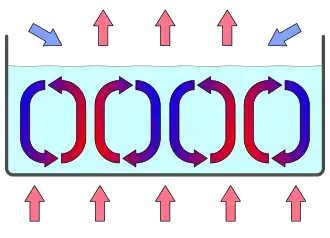A convection cell, also known as a Bénard cell, is a characteristic fluid flow pattern in many convection systems. A rising body of fluid typically loses heat because it encounters a colder surface. In liquid, this occurs because it exchanges heat with colder liquid through direct exchange. In the example of the Earth's atmosphere, this occurs because it radiates heat. Because of this heat loss the fluid becomes denser than the fluid underneath it, which is still rising. Since it cannot descend through the rising fluid, it moves to one side. At some distance, its downward force overcomes the rising force beneath it, and the fluid begins to descend. As it descends, it warms again and the cycle repeats itself. Additionally, convection cells can arise due to density variations resulting from differences in the composition of electrolytes.[13]