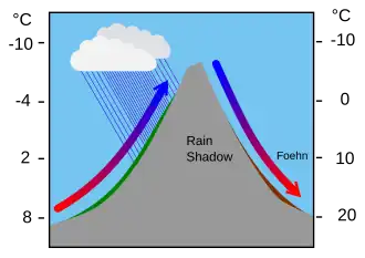 Some more localized phenomena than global atmospheric movement are also due to convection, including wind and some of the hydrologic cycle. For example, a foehn wind is a down-slope wind which occurs on the downwind side of a mountain range. It results from the adiabatic warming of air which has dropped most of its moisture on windward slopes.[14] Because of the different adiabatic lapse rates of moist and dry air, the air on the leeward slopes becomes warmer than at the same height on the windward slopes.