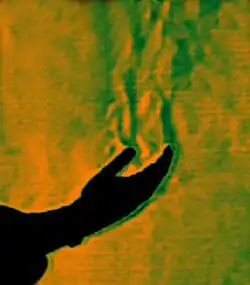 Thermal convection in liquids can be demonstrated by placing a heat source (for example, a Bunsen burner) at the side of a container with a liquid. Adding a dye to the water (such as food colouring) will enable visualisation of the flow.[8][9]