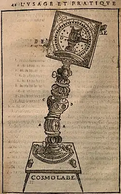 This article incorporates text from a publication now in the public domain: Chambers, Ephraim, ed. (1728). Cyclopædia, or an Universal Dictionary of Arts and Sciences (1st ed.). James and John Knapton, et al. {{cite encyclopedia}}: Missing or empty|title=(help)- This book, written in the old french language, is the original book "Le Cosmolabe", September 1566, by Professor of Sciences in Orlean, Jacques Besson, Paris/France [1] and is in the public domain.