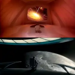 Tyson spoke about the "love-hate relationship" viewers had with the original series' Spaceship of the Imagination, but confirmed during production that they were developing "vehicles of storytelling".[11] Tyson affirmed that defining elements of the original series, such as the Spaceship of the Imagination and the Cosmic Calendar with improved special effects, as well as new elements, would be present. Animation for these sequences was ultimately created by a team hand-picked by MacFarlane for the series.[10] Kara Vallow developed and produced the animation, and the animation studio used was Six Point Harness in Los Angeles, California.[14] The sound of the Spaceship of the Imagination, and sound design in general, was created by Rick Steele, who said of the show: "Cosmos has been, by far, the most challenging show of my career."[15] The updated Spaceship was designed to "remain timeless and very simple", according to MacFarlane, using the ceiling to project future events and the floor for those in the past, to allow Tyson, as the host, to "take [the viewer] to the places that he's talking about".[16]