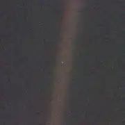 ![]() Earth as a pale blue dot in the middle of the band of light, taken by Voyager I from outside the orbit of Neptune Tyson begins the episode by noting how the destruction of the Library of Alexandria lost much of humanity's knowledge to that point. He then contrasts on the strive for humanity to continue to discover new facts about the universe and the need to not close off further discovery. Tyson then proceeds to describe the discovery of cosmic rays by Victor Hess through high-altitude balloon trips, where radiation increased the farther one was from the surface. Swiss Astronomer Fritz Zwicky, in studying supernovae, postulated that these cosmic rays originated from these events instead of electromagnetic radiation. Zwicky would continue to study supernovae, and by looking at standard candles that they emitted, estimated the movement of the galaxies in the universe. His calculations suggested that there must be more mass in the universe than those apparent in the observable galaxies, and called this dark matter. Initially forgotten, Zwicky's theory was confirmed by the work of Vera Rubin, who observed that the rotation of stars at the edges of observable galaxies did not follow expected rotational behavior without considering dark matter. This further led to the proposal of dark energy as a viable theory to account for the universe's increasing rate of expansion. Tyson then describes the interstellar travel, using the two Voyager probes. Besides the abilities to identify several features on the planets of the Solar System, Voyager I was able to recently demonstrate the existence of the Sun's variable heliosphere which helps buffer the Solar System from interstellar winds. Tyson describes Carl Sagan's role in the Voyager program, including creating the Voyager Golden Record to encapsulate humanity and Earth's position in the universe, and convincing the program directors to have Voyager I to take a picture of Earth from beyond the orbit of Neptune, creating the image of the Pale Blue Dot. Tyson concludes the series by emphasizing Sagan's message on the human condition in the vastness of the cosmos, and to encourage viewers to continue to explore and discover what else the universe has to offer. The series concludes with the empty-seated Ship of the Imagination leaving Earth and traveling through space as Tyson looks on from planet Earth. | |||||