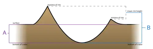 The diagram above shows the full (side) view of a typical crater. Depth "A" measures from the surface to the bottom of the crater. Depth "B" measures from the mean height of the rim to the bottom of the crater.