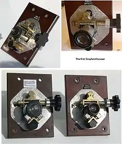 The Crayford focuser is a simplified focusing mechanism for amateur astronomical telescopes. Crayford focusers are considered superior to entry-level rack and pinion focusers, normally found in this type of device. Instead of the rack and pinion, they have a smooth spring-loaded shaft which holds the focus tube against four opposing bearing surfaces, and controls its movement. It is named after the Crayford Manor House Astronomical Society, Crayford, London, England, where it was invented by John Wall, a member of the astronomical society which meets there. The original Crayford Focuser is on display there.
