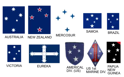 A stylized version of Crux appears on the Australian Eureka Flag. The constellation was also used on the dark blue, shield-like patch worn by personnel of the U.S. Army's Americal Division, which was organized in the Southern Hemisphere, on the island of New Caledonia, and also on the blue diamond of the U.S. 1st Marine Division, which fought on the Southern Hemisphere islands of Guadalcanal and New Britain.