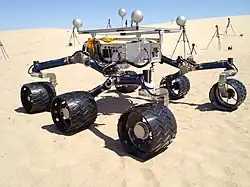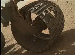 - Mobility systems: Curiosity is equipped with six 50 cm (20 in) diameter wheels in a rocker-bogie suspension. These are scaled versions of those used on Mars Exploration Rovers (MER).[27] The suspension system also served as landing gear for the vehicle, unlike its smaller predecessors.[51][52] Each wheel has cleats and is independently actuated and geared, providing for climbing in soft sand and scrambling over rocks. Each front and rear wheel can be independently steered, allowing the vehicle to turn in place as well as execute arcing turns.[27] Each wheel has a pattern that helps it maintain traction but also leaves patterned tracks in the sandy surface of Mars. That pattern is used by on-board cameras to estimate the distance traveled. The pattern itself is Morse code for "JPL" (·--- ·--· ·-··).[53] The rover is capable of climbing sand dunes with slopes up to 12.5°.[54] Based on the center of mass, the vehicle can withstand a tilt of at least 50° in any direction without overturning, but automatic sensors limit the rover from exceeding 30° tilts.[27] After six years of use, the wheels are visibly worn with punctures and tears.[55]