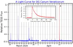 ![]() A light curve for DG Canum Venaticorum, plotted from TESS data.[1] The main plot shows both the low amplitude periodic oscillations, and several flares. The inset plot shows the strongest flare with an expanded time scale. | |