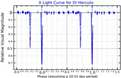 DI Herculis is an Algol-type eclipsing binary star in the constellation of Hercules. The system has an apparent magnitude of about +8.5 and consists of two young blue stars of spectral type B5 and B4.[4] It is about two thousand light years from Earth.[2]