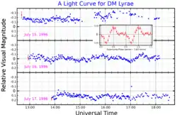 ![]() A visual band light curve for DM Lyrae, adapted from Nogami et al. (2003).[1] The inset plot shows the superhump variations. | |