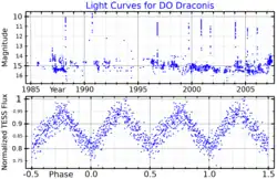 ![]() Light curves for DO Draconis. The upper plot, adapted from Andronov et al.,[1] shows the long-term variability and eruptive behaviour. The lower plot, adapted from Hill et al.,[2] shows the ellipsoidal variability assuming a period of 3.96898 hours. | |